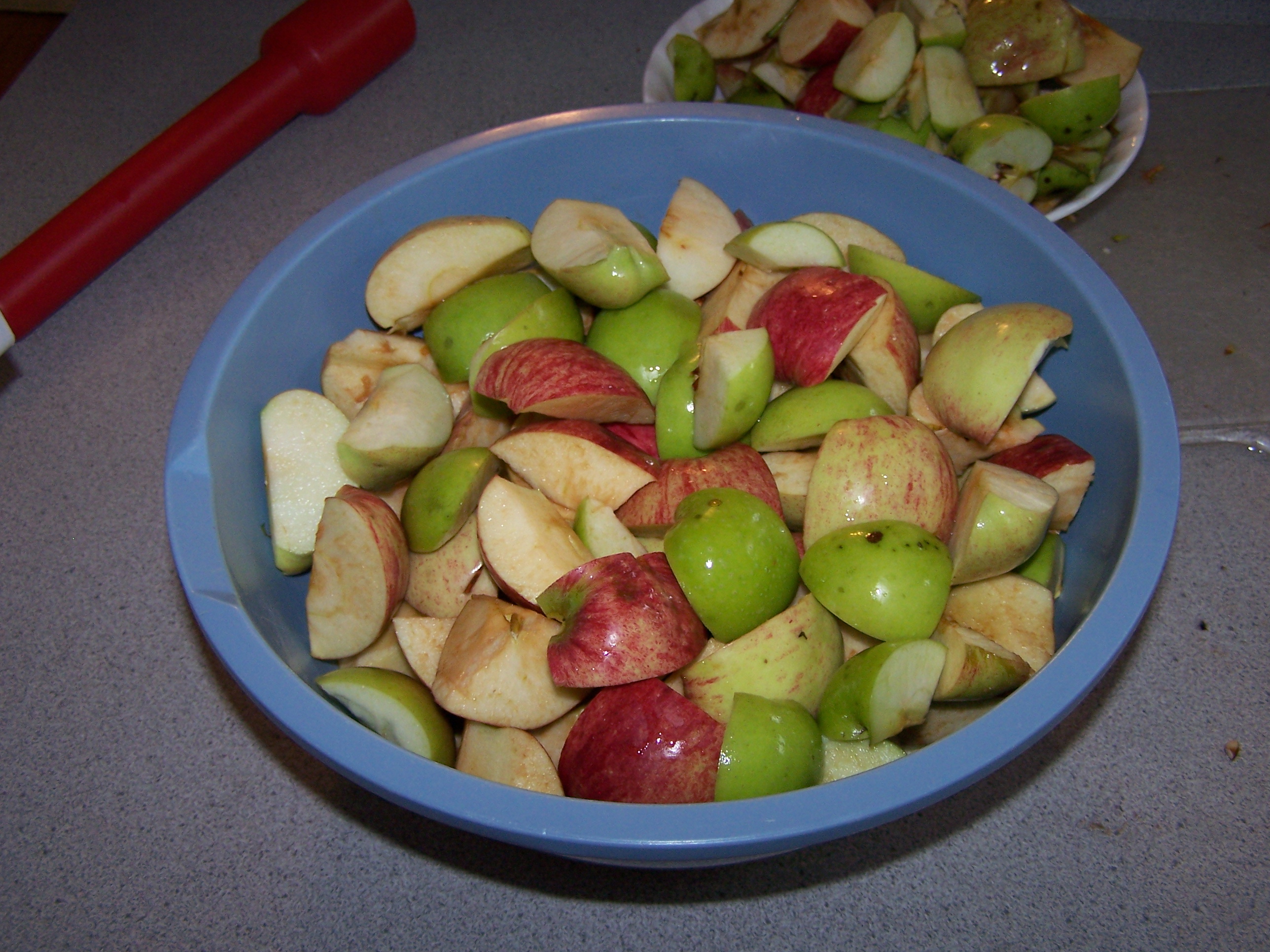 Put a few inches of water in your pans with the apples and cook till the fruit is soft. Stir frequently so they don’t burn! Warning! The fragrance will be wonderful!