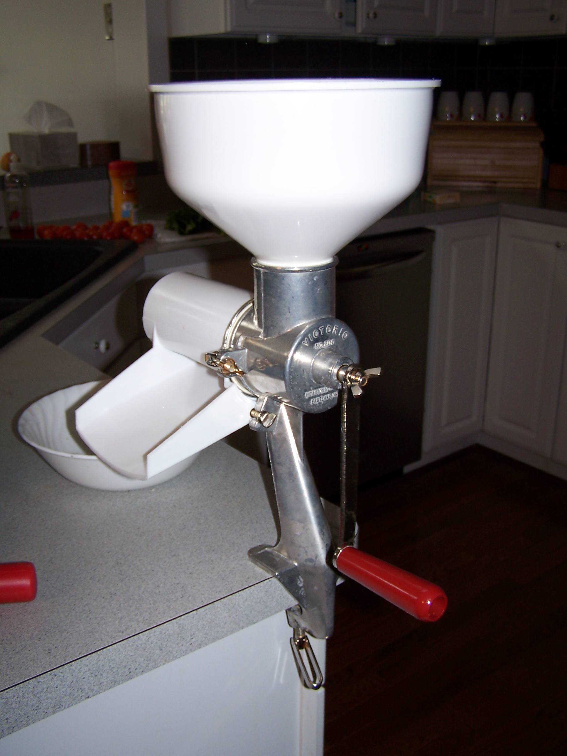 This little machine assembles easily and clamps onto the counter or table. The hot, cooked apple mush is ladled into the bowl at the top, and you crank the handle on the side. The strained sauce comes down the chute and all of the other debris is deposited out of the side.